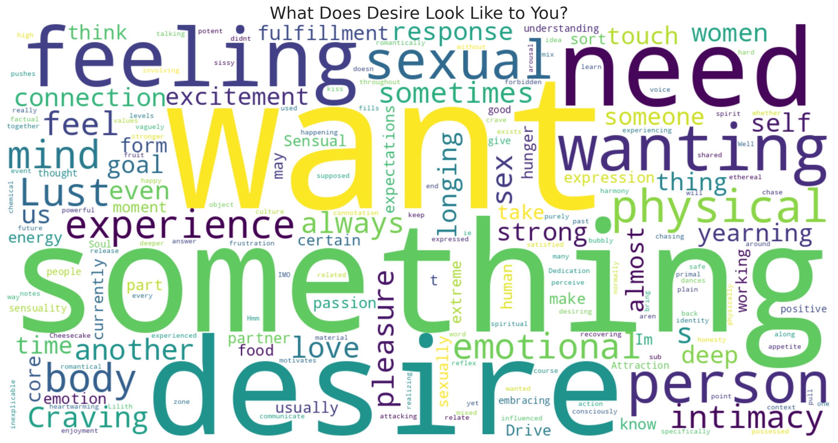 The first thing the survey asked was for you to describe what Desire looks like to you. This was a fascinating and open ended question, and the results are shown below in the word cloud.